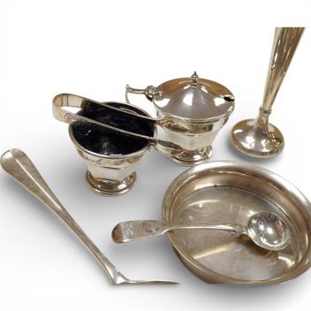 Lot 853 , Sundry small silver white metal including a pair of coasters?, flatware, condiments, sugar caster, Charles S. Green & Co, Birmingham, 1945, and a spill vase.