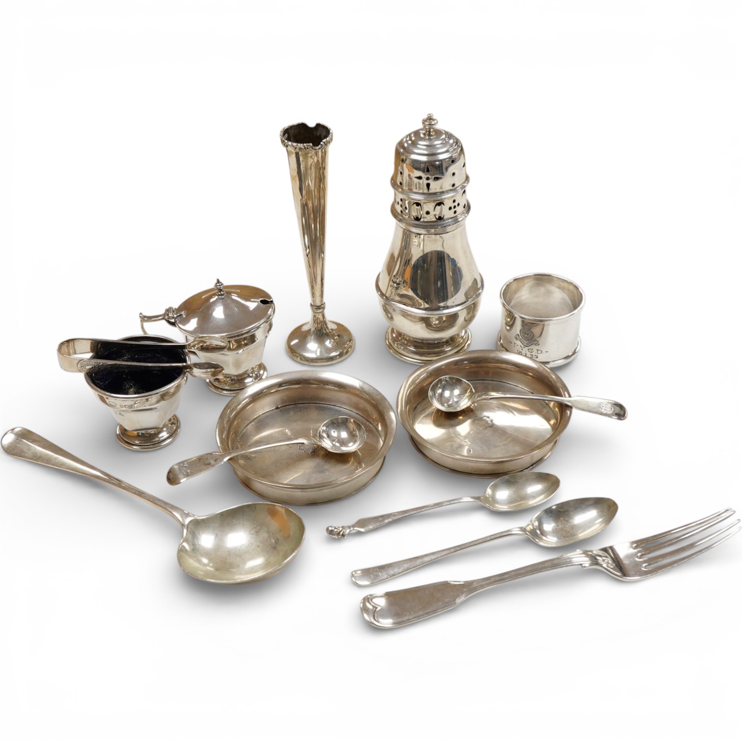 Sundry small silver white metal including a pair of coasters?, flatware, condiments, sugar caster, Charles S. Green & Co, Birmingham, 1945, and a spill vase.