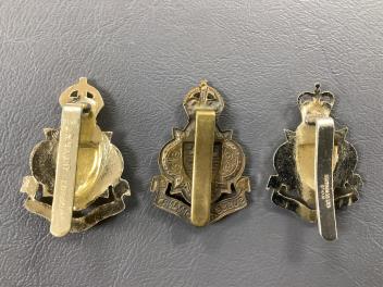 Lot 509 , Sussex Imperial Yeomanry brass cap badges, one to right engraved HW. Timings Ltd B' Ham, centre badge engraved J. R. Gaunt London, both to reverse of clip, (3).