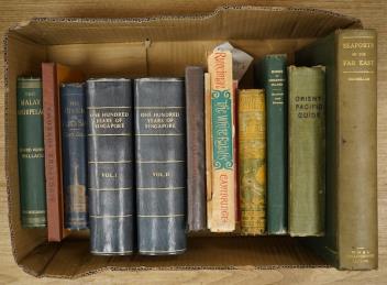 Swettenham - cloth lt. creased and marked, ex Seafarers Education Service (with w/drawn bkplt.) xi,295pp. (incl. half title) and John Lane's 40pp cat.; Seaports - spine lt. wear and faded, soiling on e/ps.; German - 1 map with clean tear, sl. cloth wear. (3), 201pp. others include Runciman's White Rajahs (d/w, 1960); Wallace - Malay Archipelago (1890); Gill's River of Golden Sand (condensed ed, 1888); 100 Years of Singapore (2 vols, 1921 - ex public lib. with stamps etc) ; Tweedie's Poisonous Animals of Malaya (Singapore, 1941; printed wrappers, errata slip, stains title and elsewhere.)