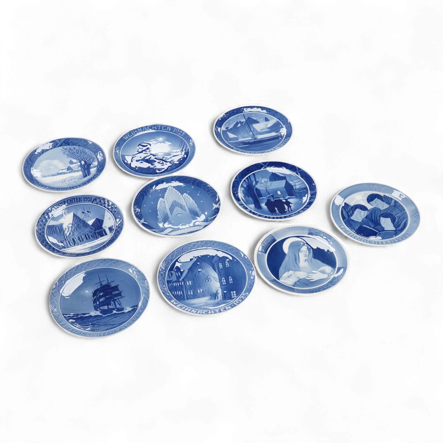 Ten Royal Copenhagen blue and white Christmas plates, 1920-1928, 18cm in diameter