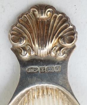 Ten assorted 19th and 20th century silver caddy spoons, with shell or fluted bowls, to include Francis Howard Ltd, Sheffield, 1977, David Hollander & Son, Birmingham, 1972, W.I. Broadway & Co, Birmingham, 1986, John Taylor, London, 1866 with fiddle, thread and shell handle, James Swann & Son, Birmingham, 1926, Samuel Whitford, London, 1871(a.f.), indistinct maker's mark, London, 1808, George Piercy, London, 1820, William Bennett, London, 1809 and continental with import marks for Samuel Boyce Landeck, London, 1896, with cupid handle, 10.6cm et infra.