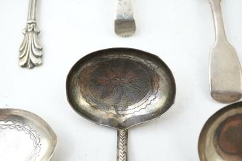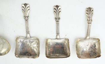 Ten assorted 19th century silver caddy spoons, to include Joseph Taylor, Birmingham, 1821, with ovoid bowl and engraved handle and bowl, (a.f.), William Pugh, Birmingham, 1811, with fiddle handle and engraved foliate bowl, George Unite, Birmingham, 1846, with feather handle and bowl, unmarked with oval bowl, Joseph Wilmore, Birmingham, 1805, George Unite, Birmingham, 1839 with feather handle, George Unite, Birmingham, 1841, with feather handle, Lias Brothers, London, 1829, Joseph Taylor, Birmingham, 1820 with shovel bowl engraved with tea leaves, Joseph Taylor, Birmingham, 1803 with oval bowl engraved with shield cartouche, 10.6cm et infra.