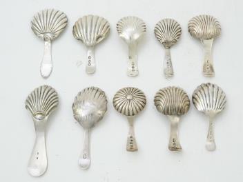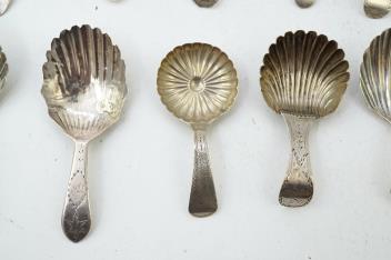Lot 27 , Ten assorted mainly 19th century silver and white metal caddy spoons, with shell or fluted bowls
