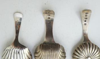 Ten assorted mainly 19th century silver and white metal caddy spoons, with shell or fluted bowls, to include French, two by Peter & Ann Bateman, London, 1793, no maker's mark, London, 1788?, continental stamped BG twice, Irish with indistinct marks(a.f.), Josiah Snatt, London, 1802, Thomas Wallis II?, London, 1809, no maker's mark, London, 1803(a.f.) and Joseph Taylor, Birmingham, 1801, 97mm et infra.