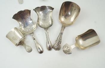 Ten assorted mainly 19th century silver caddy spoons, most with shovel bowls, to include John Bettridge, Birmingham, 1821,  Levy & Salaman, Birmingham, 1900, with honeysuckle handle, London, 1981, with thin handle,  indistinct marks, with mother of pearl handle, unmarked hourglass pattern (a.f.), George Unite, Birmingham, 1834 (a.f.), John Bettridge, Birmingham, 1818 (a.f.), Joseph Taylor, Birmingham, 1811, Cocks & Bettridge, Birmingham, 1805, with fern engraved bowl, no maker's mark, Birmingham, 1807, with leaf engraved bowl, 89mm et infra.