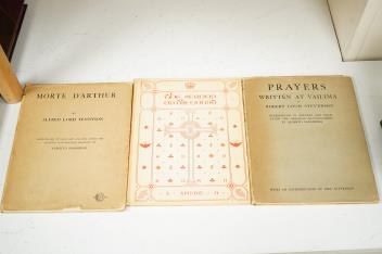 ° Tennyson, Alfred - Morte D'Arthur. 'as designed, written out and illuminated by Alberto Sangorski', printed in gold and colours by the Graphic Engineering Company; i.e. title, 22 leaves and colophon; original red printed art vellum boards and d/wrapper, sm. 4to. Chatto & Windus, 1912. *entirely unopened; The Sermon on the Mount - 'as designed, written out and illuminated by Alberto Sangorski', printed in gold and colours by the Graphic Engineering Company; i.e. title, 22 leaves and colophon; publisher's red printed and decorated cloth boards, gilt top, sm. 4to. Chatto & Windus, 1911. *entirely unopened; Stevenson, Robert Louis - Prayers Written by Vailima. 'as designed, written out and illuminated by Alberto Sanorski', printed in gold and colours by the Graphic Engineering Company; i.e. title, 22 leaves and colophon; publisher's red printed art vellum and d/wrapper, sm. 4to. Chatto & Windus, 3rd impression 1922. *save for the title/p.(2) entirely unopened. (3)