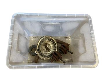 The tubular steel frame of a motorcycle sidecar for restoration, including the wheel, mud guard and drum brake assembly, etc.
