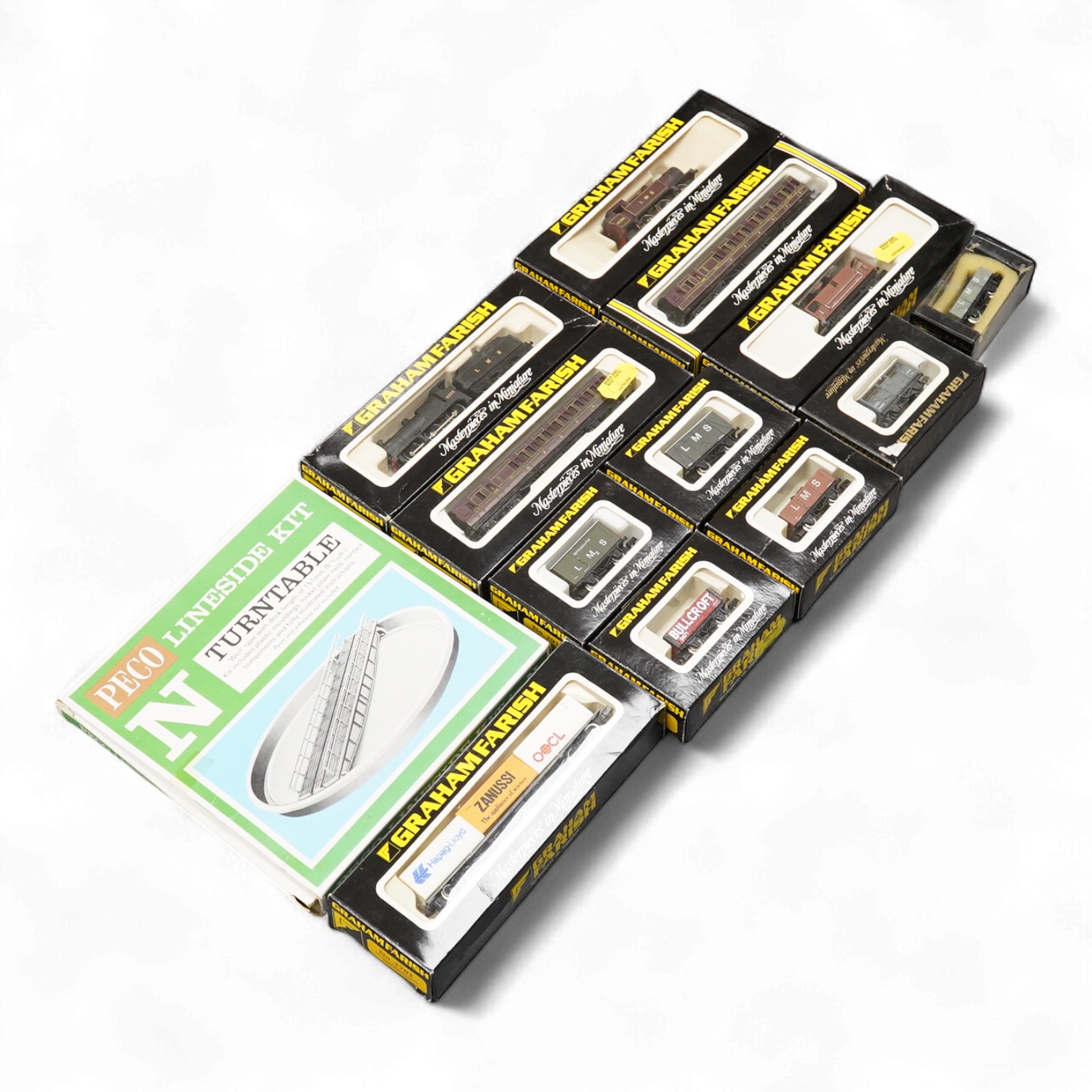 Thirteen N gauge railway by Graham Farish, etc., including two locomotives; a BR Class 4 0-6-0 tender locomotive, 4232, and an LMS 0-6-0T locomotive, 16389, together with two bogie coaches, eight freight wagons, and a Peco turntable, most items boxed, some in associated/incorrect boxes