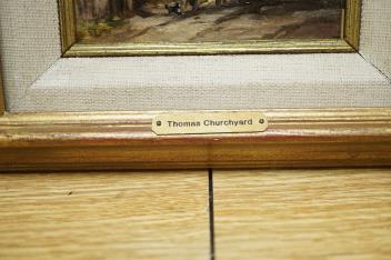 Lot 737 , Thomas Churchyard (1798-1865), Street scene other figure and dog, unsigned, indistinctly inscribed in pencil verso, oil on board, 9 x 8cm