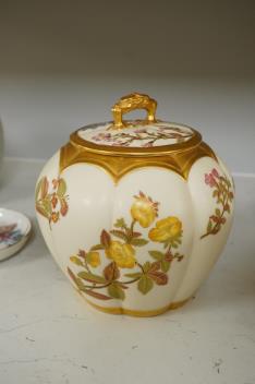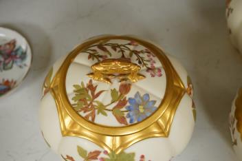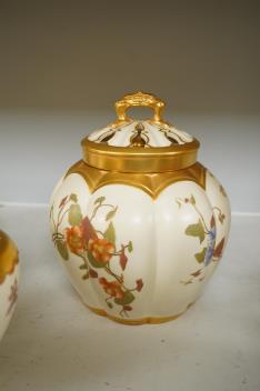 Lot 1523 , Three 19th century Worcester blush ivory potpourri or biscuit jars and covers, two with liners, each decorated with flowers and buds, largest 20cm high