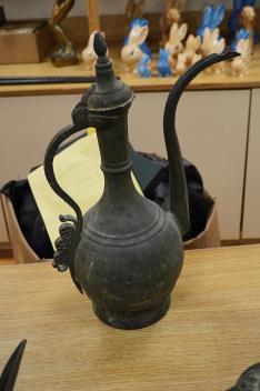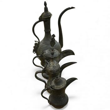 Lot 382 , Three Arabic dallahs, two brass, one copper and a copper coffee ewer, 45cm
