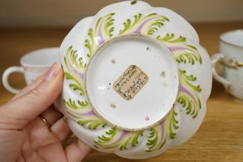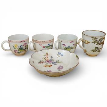 Lot 258 , Three Bow polychrome coffee cups, a Chelsea Red Anchor saucer, and a Chelsea Gold Anchor coffee cup painted with birds, saucer 12cm