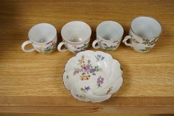 Three Bow polychrome coffee cups, a Chelsea Red Anchor saucer, and a Chelsea Gold Anchor coffee cup painted with birds, saucer 12cm