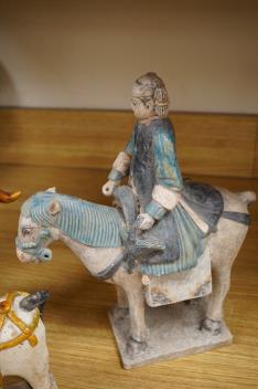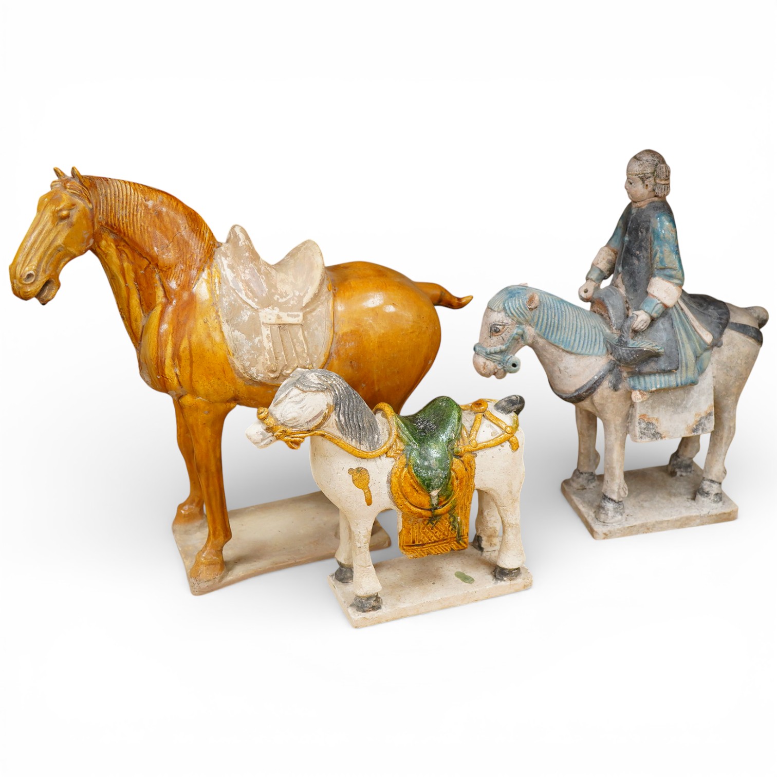 Three Chinese Tang-style tomb horses, tallest 35cm