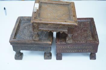 Lot 556 , Three Indian carved wood stools or small tables, largest 27cm wide