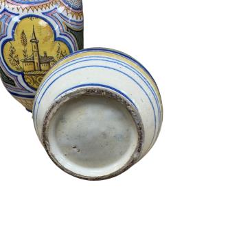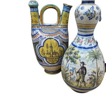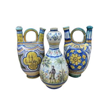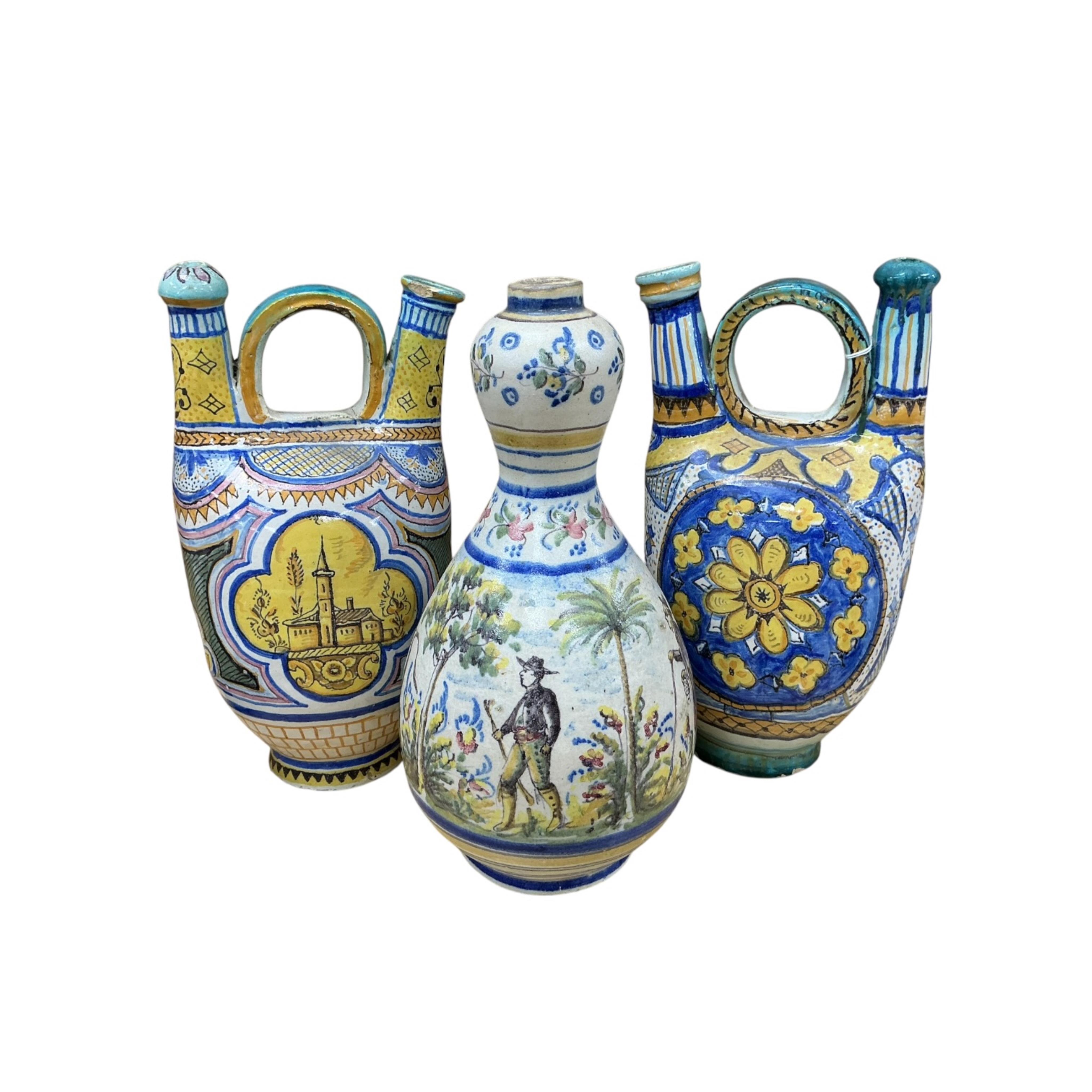 Lot 3574 , Three Italian maiolica pottery wine ewers, largest 33cm high.