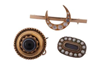 Three Victorian brooches, 19th century, comprising: a crescent moon bar brooch set with cabochon moonstones, mounted in gold, length 4.3cm; a circular locket brooch set with a cabochon of banded onyx, within a polished gold surround; and a mourning brooch of panel design, centring on a glazed compartment of hairwork, bordered by split pearls, pearls untested, combined gross weight approximately 12.3 grams