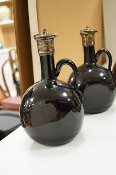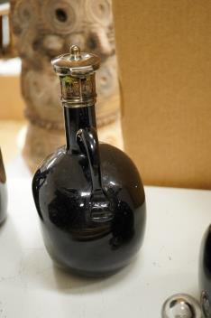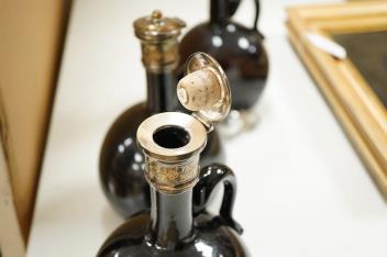 Lot 1571 , Three Victorian silver mounted glass spirit flasks, engraved 'Brandy', 'Whisky' and 'Gin', Atkin Brothers, Sheffield, 1874, 20.7cm.