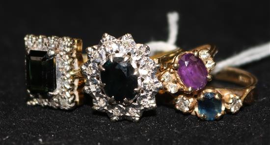 Three assorted 18ct gold and gem set dress rings and a similar 14ct gold ring.