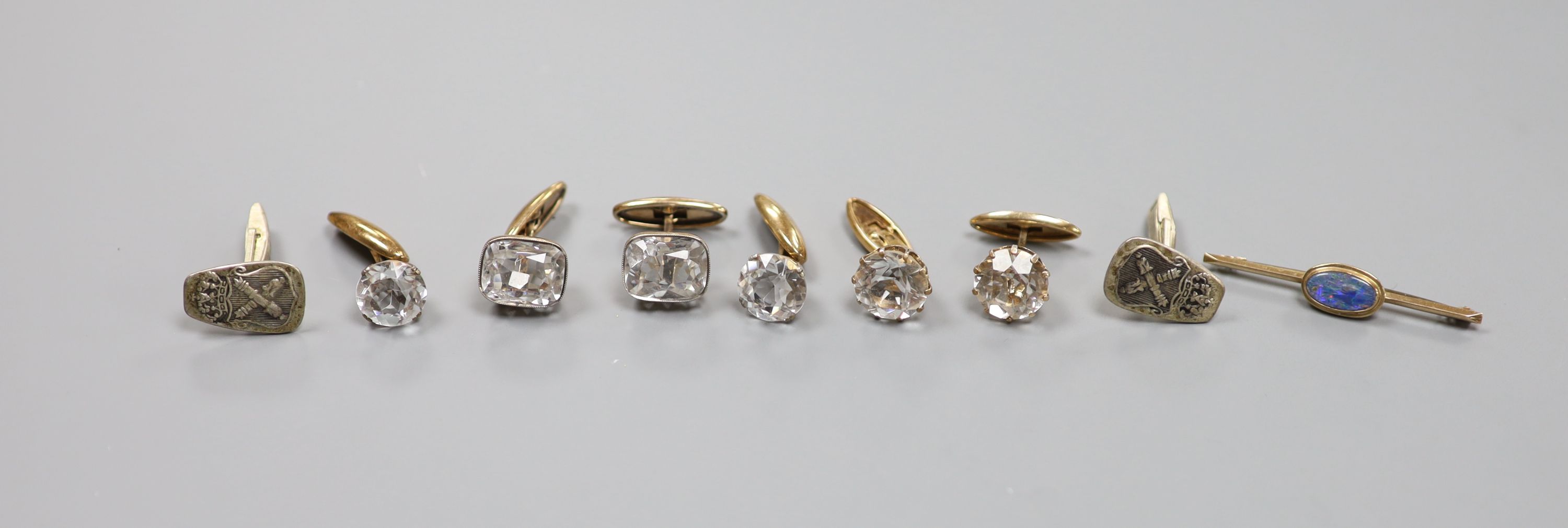 Three assorted pairs of continental gilt white metal and rock crystal set cufflinks, one other pair, a 9ct and black opal doublet set bar brooch and an unmounted synthetic ruby.