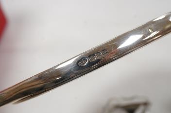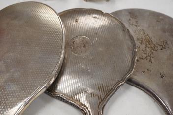 Lot 1830 , Three assorted silver mounted hand mirrors, including engine turned by Goldsmiths & Silversmiths Co Ltd, London, 1927, 26.7cm, together with a pair of German 800 standard white metal salts, with clear glass liners.