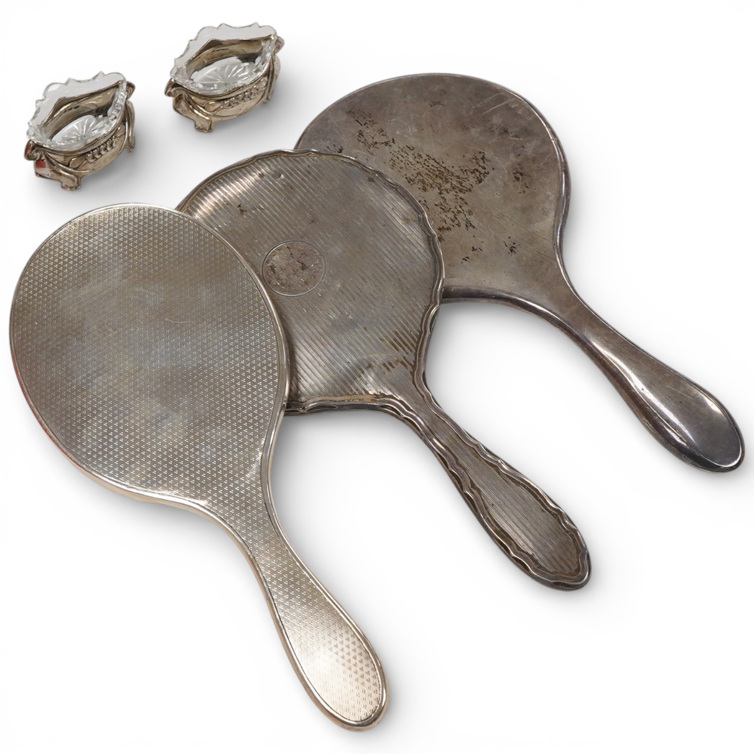 Three assorted silver mounted hand mirrors, including engine turned by Goldsmiths & Silversmiths Co Ltd, London, 1927, 26.7cm, together with a pair of German 800 standard white metal salts, with clear glass liners.