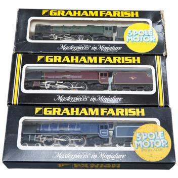 Lot 11 , Three boxed Graham Farish N gauge railway BR Coronation class 4-6-2 tender locomotives; King George VI 46244, (1814), City of Liverpool 46247 (1815), and Queen Elizabeth 46221 (1817)