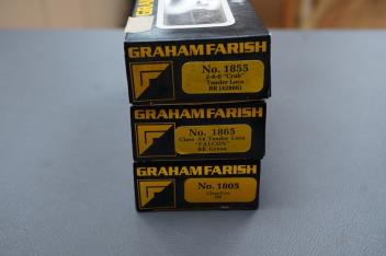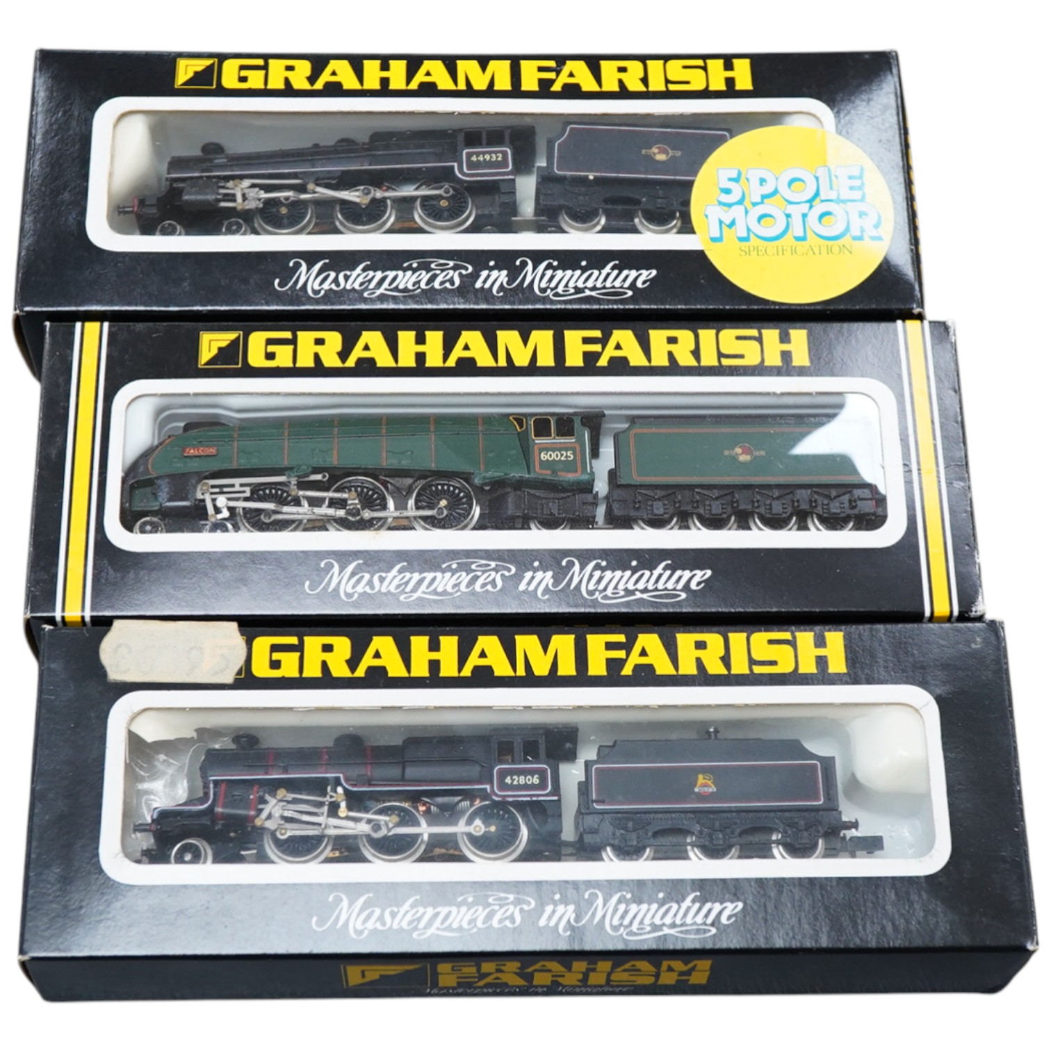 Three boxed Graham Farish N gauge railway BR tender locomotives; a class A4, Falcon 60025, (1865), a 2-6-0 crab, 42806, (1855), and a Class Five 4-6-0, 44932, (1805)
