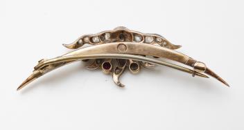Three brooches, 19th and 20th century, comprising: a Victorian late 19th century brooch designed as a sunburst on a crescent moon, set with cushion-shaped diamonds and circular-cut rubies, centring on a pearl, mounted in silver and gold, length 5.3cm, gross weight approximately 6 grams; a Victorian gold, ruby and pearl panel brooch, length 4.7cm, stamped 9CT, gross weight approximately 2.5 grams; and a Royal Navy Submarine Services 'gold dolphin' badge, depicting two confronted dolphins flanking a crowned anchor, in 9ct gold, accented with red enamel, length 4.1cm, British hallmark, gross weight approximately 3 grams