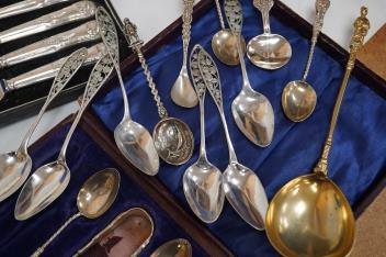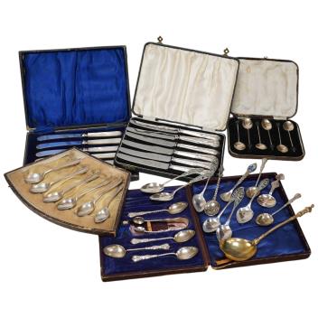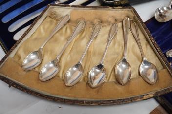 Lot 1045 , Three cased sets of six silver teaspoons, including bean end and one with tongs, together with a set of six continental white metal teaspoons, a cased set of six silver handled tea knives, a gilt apostle spoon and a case