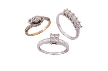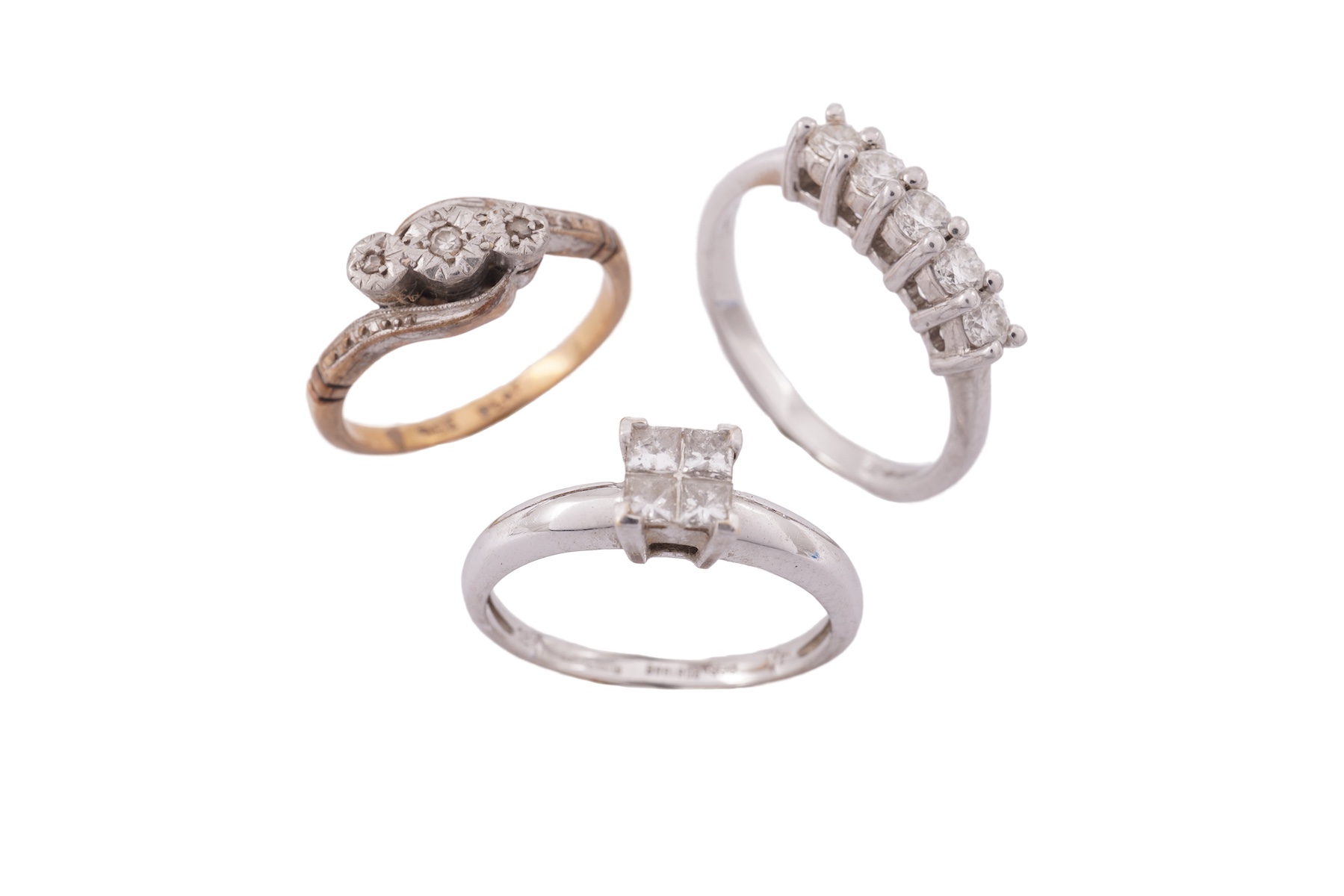 Three diamond rings, comprising: a ring set with four princess-cut diamonds totalling approximately 0.40 carats, mounted in 18ct gold, size L1/2, British hallmarks, gross weight approximately 2.4 grams; a diamond five-stone ring totalling approximately 0.35 carats, mounted in platinum, size N1/2, British hallmarks; gross weight approximately 4.7 grams; and an early 20th century set with three single-cut diamonds in gold and platinum, size J, stamped 9ct PLAT, gross weight approximately 2.3 grams