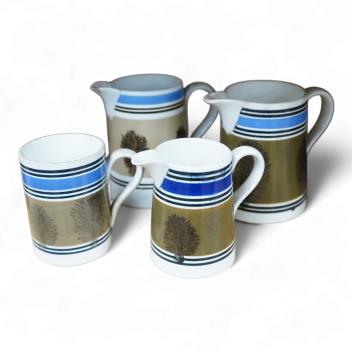 Three early 19th century Mocha ware jugs and a mug, largest 16cm high