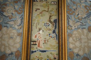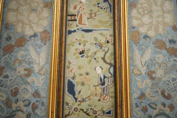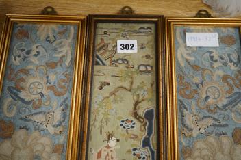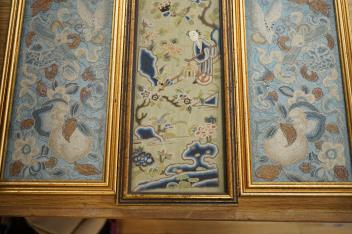 Lot 302 , Three late 19th / early 20th century Chinese Peking Chinese knot sleeve bands including a pair of floral and butterfly blue silk sleeve bands and a single green damask figural sleeve band, 52cm x 9.5cm. Condition - good,