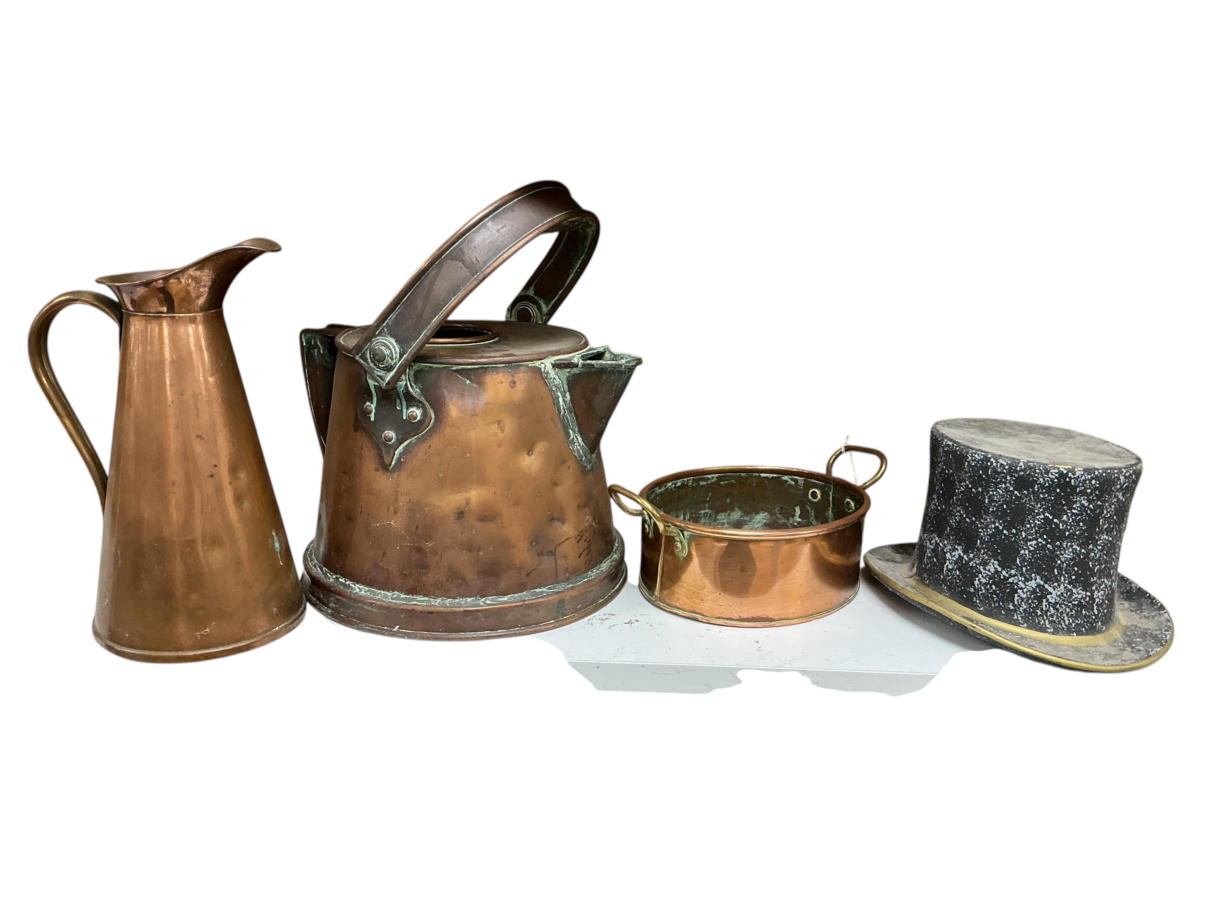 Lot 1346 , Three pieces of copper ware to include a jug and large teapot together with a ceramic model of top hat, largest 39cm high