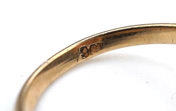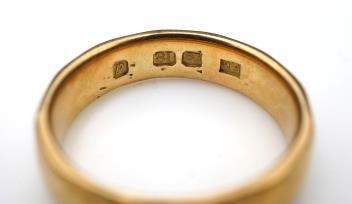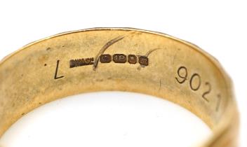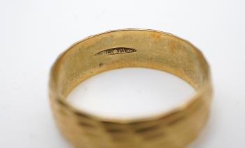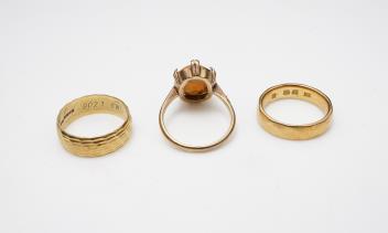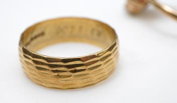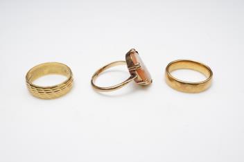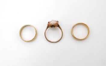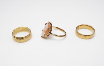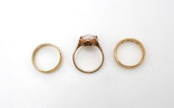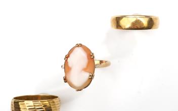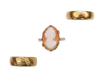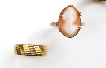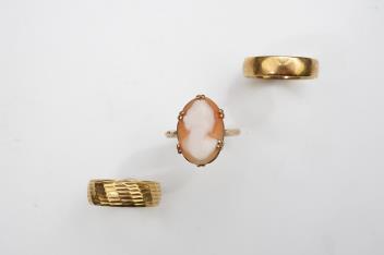 Lot 2969 , Three rings, comprising: two 18ct gold wedding bands, of planished and textured design, sizes K and L respectively, each with British hallmarks, combined gross weight approximately 11 grams; and a shell cameo ring mounte