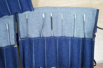 Lot 2266 , Three sets of Ashley Iles wood carving tools, contained within denim tool rolls; the York Set, the Supplementary Set No.Two, and the Supplementary Set No.Three, each comprising of six chisels (18 chisels in total)