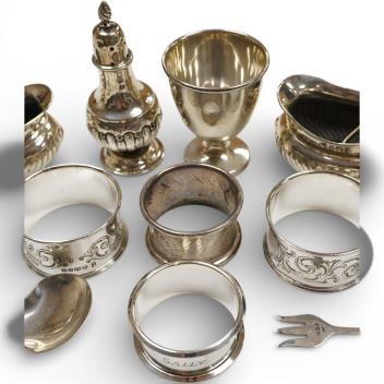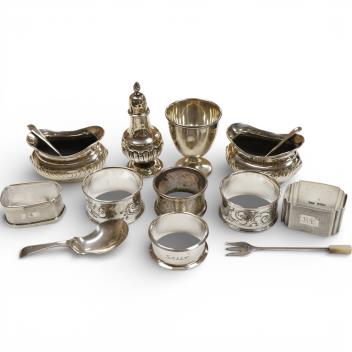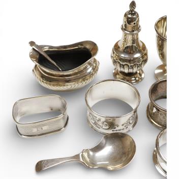 Lot 844 , Three silver condiments including a pair of salts, Birmingham, 1903, with two spoons, six assorted silver napkin rings, a silver egg cup, a silver caddy spoon and a small silver pickle fork.