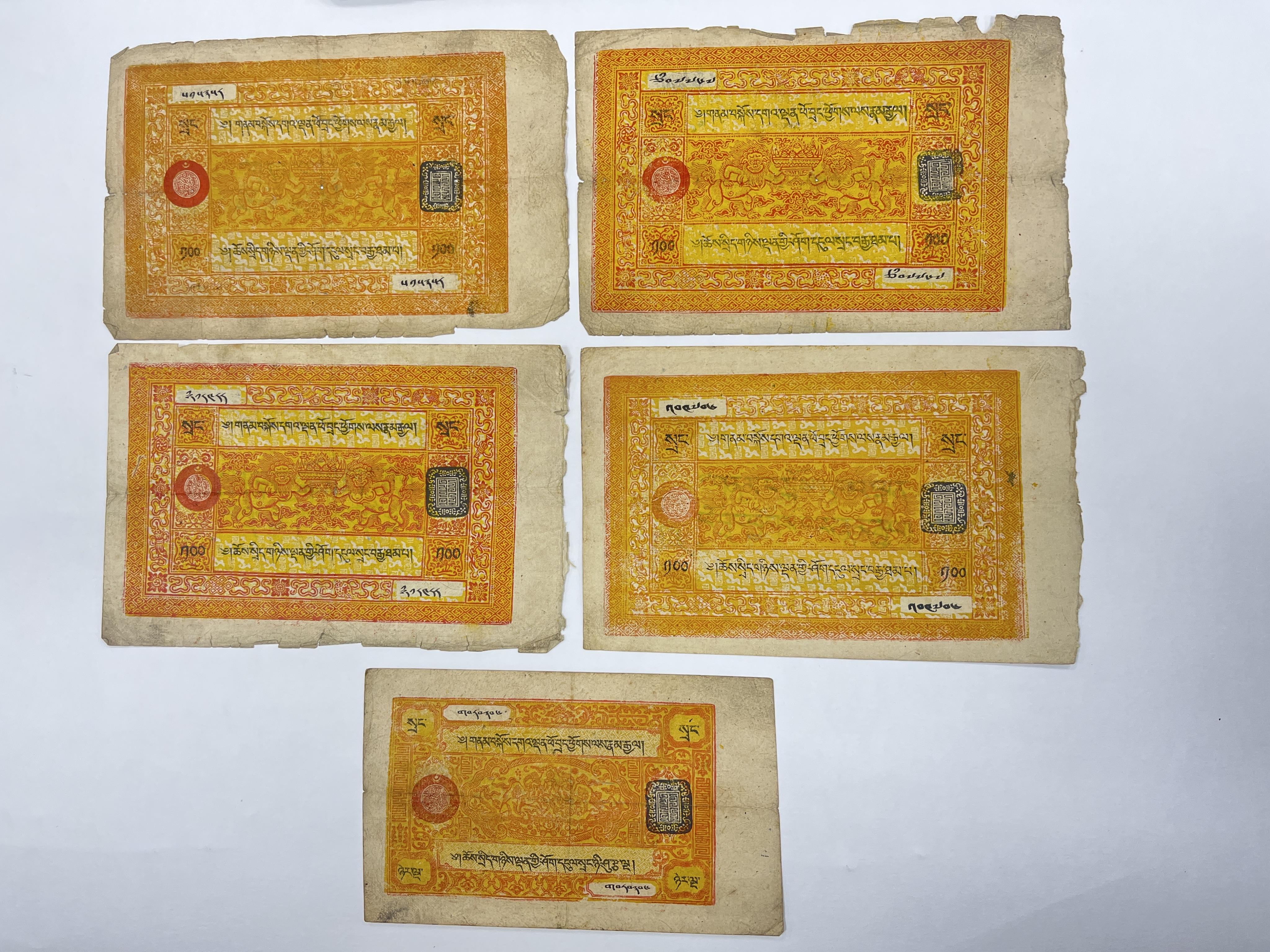 Lot 2055 , Tibet banknotes, Autonomous issue, (1942-9), four 100 Srang and a 25 Srang banknote (5)