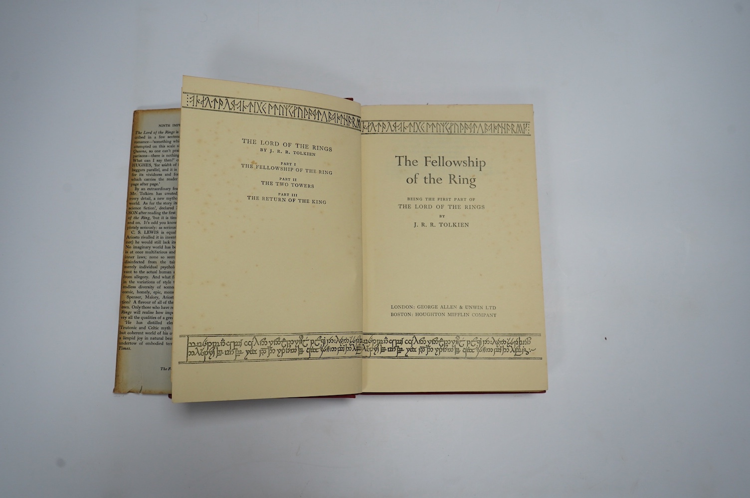 ° Tolkien, J.J.R - Lord of the Rings, 3 vols, to consist of The Fellowship of the Ring, first edition, 8th. impression, original cloth, folding map at rear, clipped dust-jacket, browned with slight loss to head of spine; The Two Towers, first edition, 7th. impression, original cloth, folding map at rear, original clipped dust-jacket with browned spine; The Return of the King, 1st edition, 6th. impression, folding map at end, original red cloth, original clipped dust-jacket, with edges and spine sunned, all George Allen & Unwin Ltd, London, 1960.