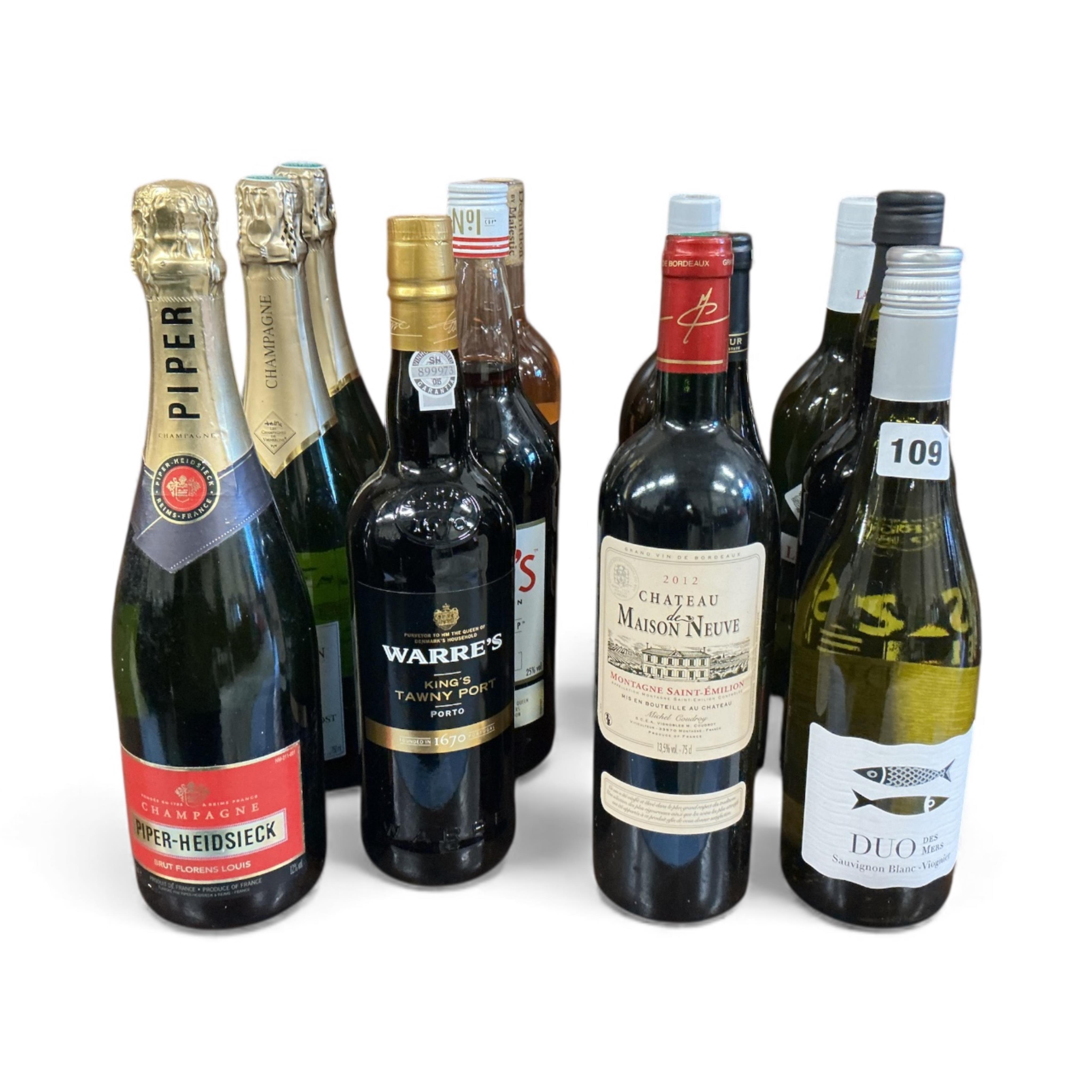 Lot 1109 , Twelve bottles of assorted champagne, port and wine, to include Piper Heidsieck, Warre's Kings Tawny Port, Chateau de Maison Neuve, St. Emilion 2012, Balfour Chardonnay etc.