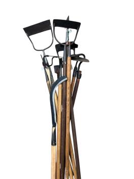 Lot 1064 , Twelve early to mid 20th century garden tools, including Dutch hoes, a long handled sickle, and a range of other hoes, etc.