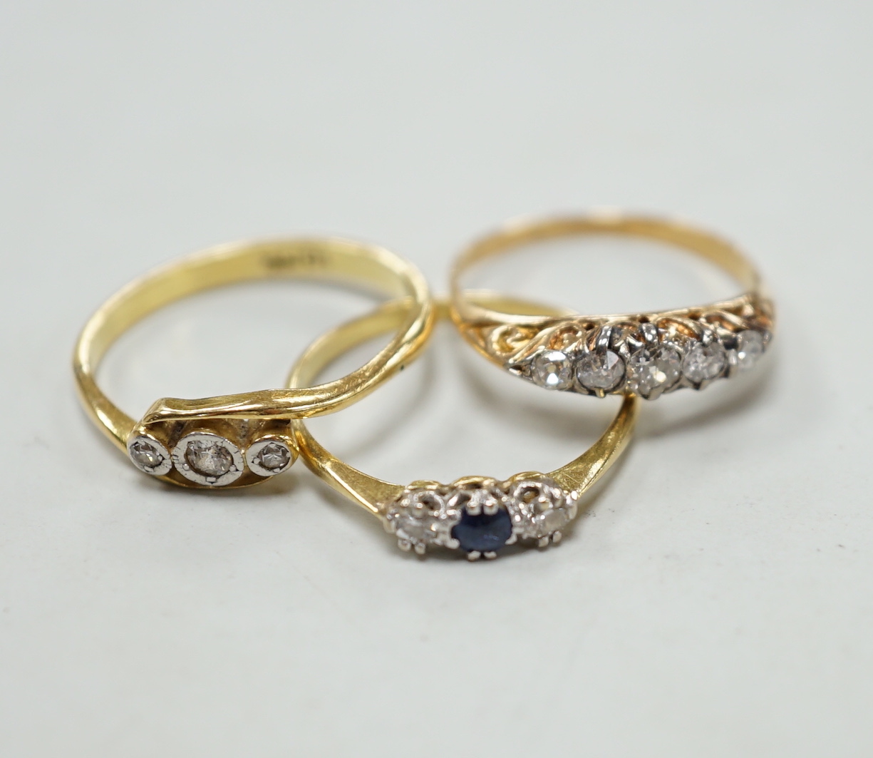 Two 18ct rings including illusion set three stone diamond and sapphire and diamond three stone and a yellow metal and graduated five stone diamond set half hoop ring, gross weight 5.8 grams.