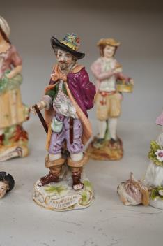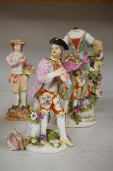 Two 18th century Derby porcelain figures, two Sitzendorf porcelain figures, and two Victorian Staffordshire pottery figures, tallest 13cm