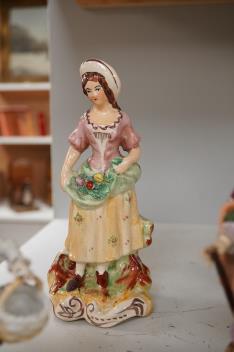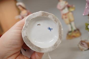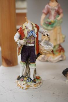 Lot 1101 , Two 18th century Derby porcelain figures, two Sitzendorf porcelain figures, and two Victorian Staffordshire pottery figures, tallest 13cm