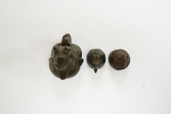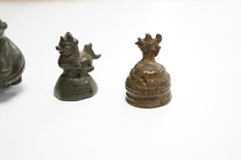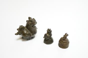 Lot 1547 , Two 19th century Burmese bronze weights, and a similar figure of a mythical beast, largest 4cm high