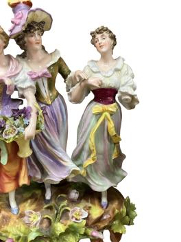 Lot 440 , Two 19th century Sitzendorf porcelain figure groups, a pair of candelabra (one part) and a miniature mirror (5) tallest 31cm.