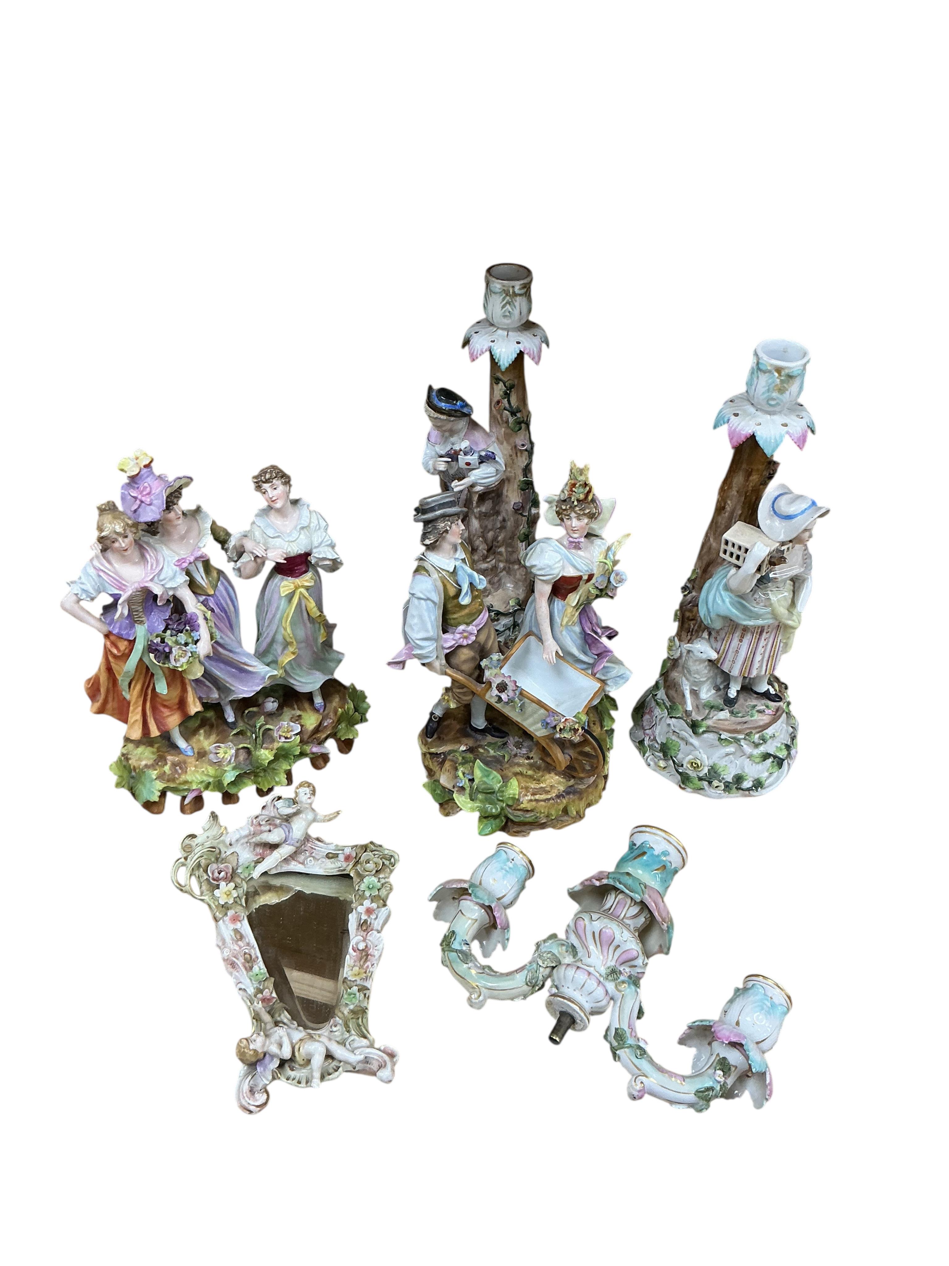 Two 19th century Sitzendorf porcelain figure groups, a pair of candelabra (one part) and a miniature mirror (5) tallest 31cm.