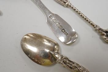 Two 19th century silver caddy spoons including Reid & Sons, Newcastle, 1837, ten assorted silver coffee spoons including apostle and a pair of George V silver sugar nips by William Hutton & Sons, 4.8oz.