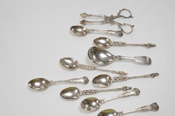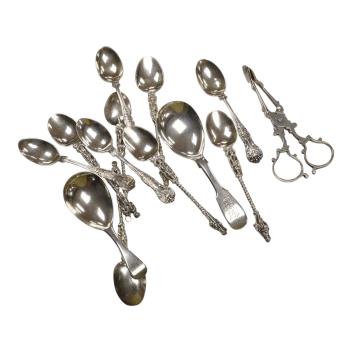 Lot 2836 , Two 19th century silver caddy spoons including Reid & Sons, Newcastle, 1837, ten assorted silver coffee spoons including apostle and a pair of George V silver sugar nips by William Hutton & Sons, 4.8oz.